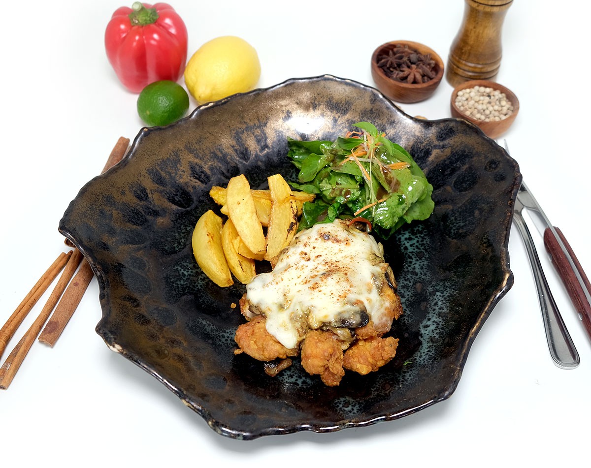 Crispy golden-fried chicken fillet, topped with creamy mushroom sauce and melted mozzarella cheese, served with homemade fries and mixed green salad