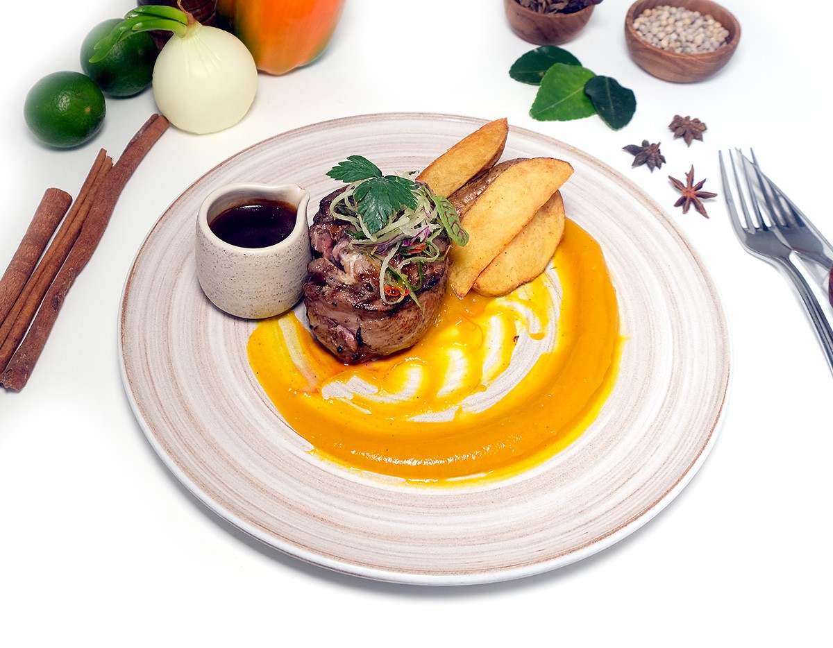 Grilled Australian beef tenderloin served with fresh potato fries, pumpkin purée, beef jus