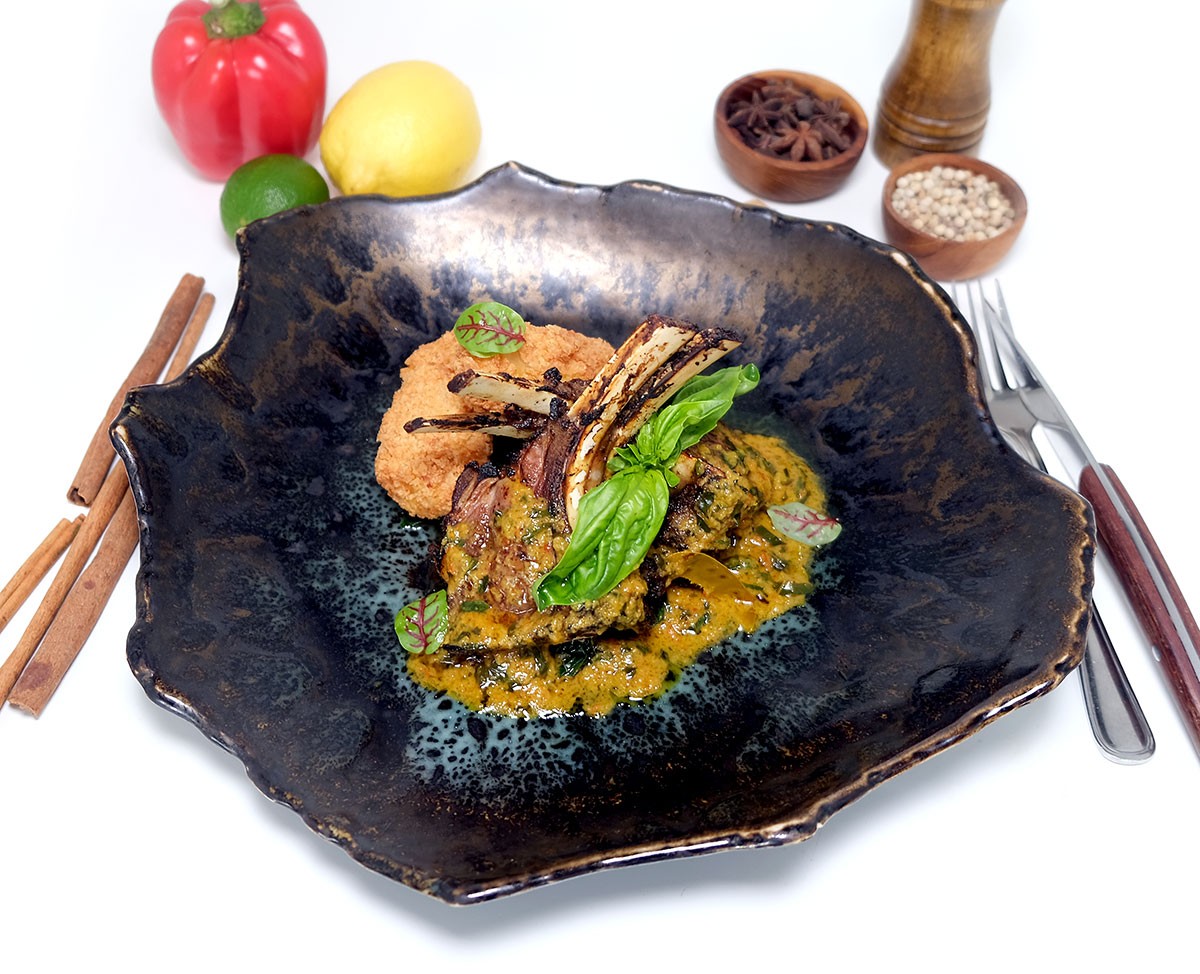 Grilled Australian lamb rack, infused with Balinese bumbu genep, served with cheese potato croquette, sautéed spinach, and coconut–kemangi sauce