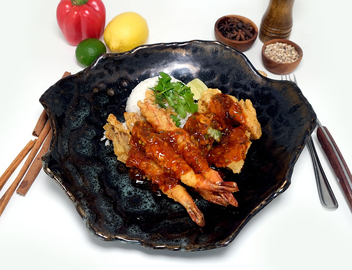 Crispy tempura prawns tossed in a spicy-sweet Manchurian sauce with garlic, soy, chili, and spring onion, served with tempura vegetables and steamed rice