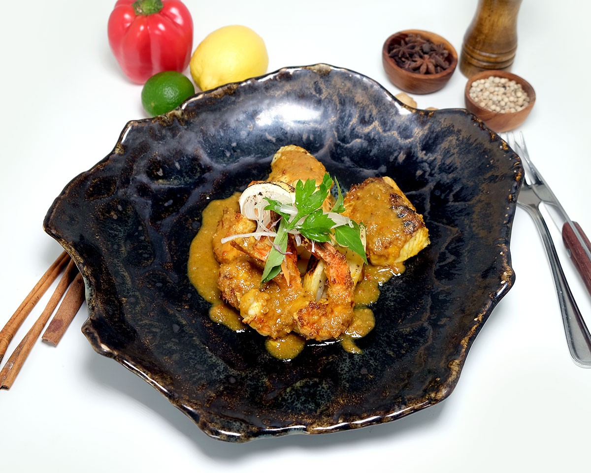 A trio of grilled prawns, squid, and fish fillet, infused with aromatic Balinese spices, served with choice of three rice